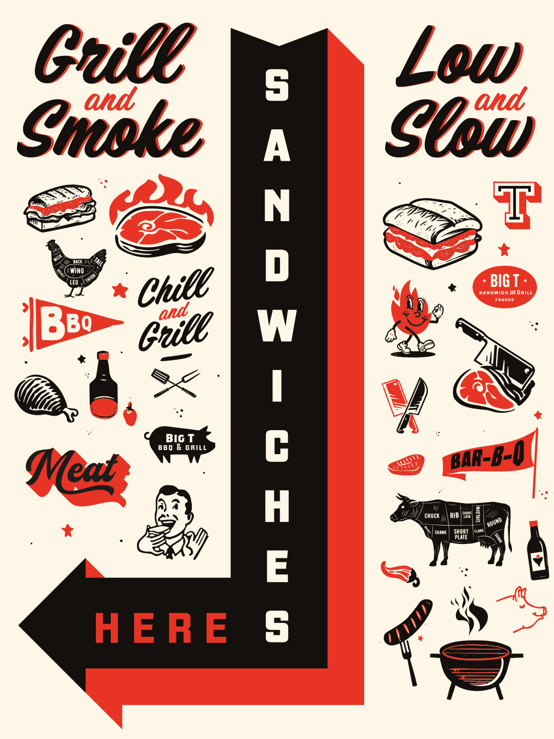 L’identité visuelle repose sur un territoire graphique puissant : typographies bold, illustrations iconiques, références à la viande, au feu et au “low & slow”. Un langage visuel volontairement expressif, conçu pour capter l’attention et installer une marque reconnaissable au premier regard.