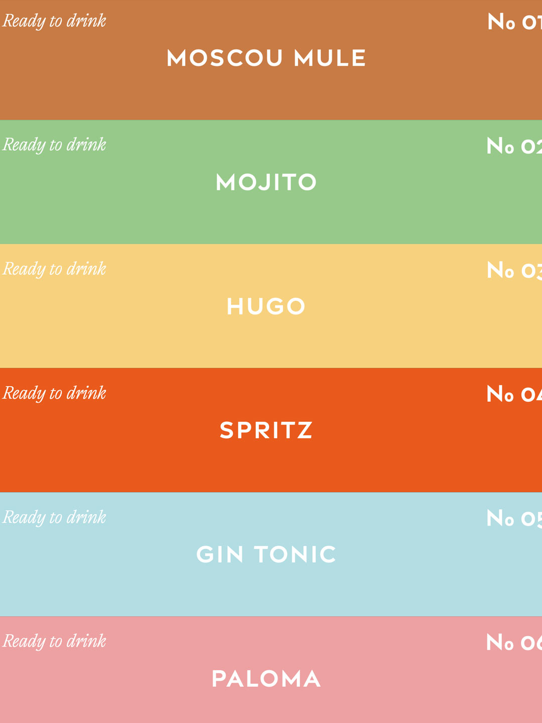Chaque recette a été traduite en un visuel fort, avec une couleur dominante évocatrice (jaune acidulé, rouge fruité, vert tonique…), une typographie audacieuse, et une illustration revisitée, inspirée des affiches des années 50. L’idée : créer une collection cohérente, facilement identifiable en rayon, tout en affirmant la personnalité unique de chaque cocktail.